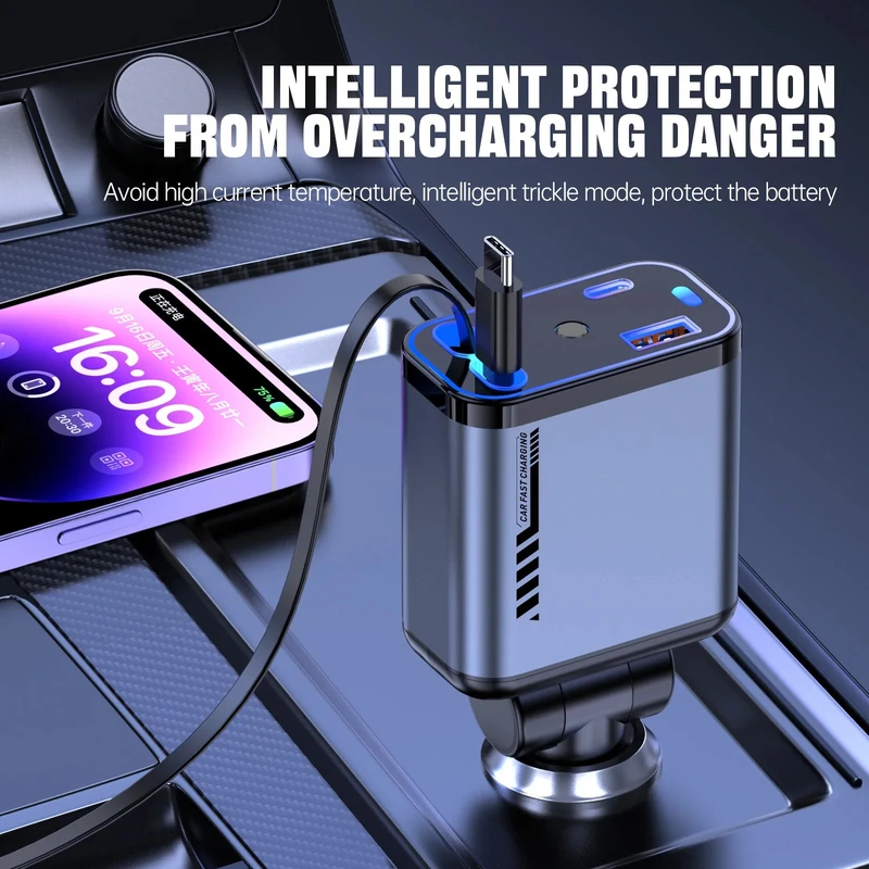 Charge up to four devices at once with dual retractable cables (Type-C + iOS) and two extra ports (USB + Type-C). Stay powered and connected, no matter where the road takes you.